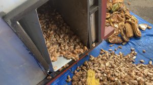 Quant au procédé, il décrit qu’« on a juste besoin des cabosses qu’on va mettre dans une bassine avant de les déverser dans la machine. Une fois que la cabosse est entrée, elle est rapidement broyée et elle ressort aussitôt, car c’est une question de secondes . A l’intérieur il y a un tamis qui sélectionne la fève d’un côté et la cabosse de l’autre. Puis, juste en bas, il y a un autre tamis qui recueille uniquement le jus».